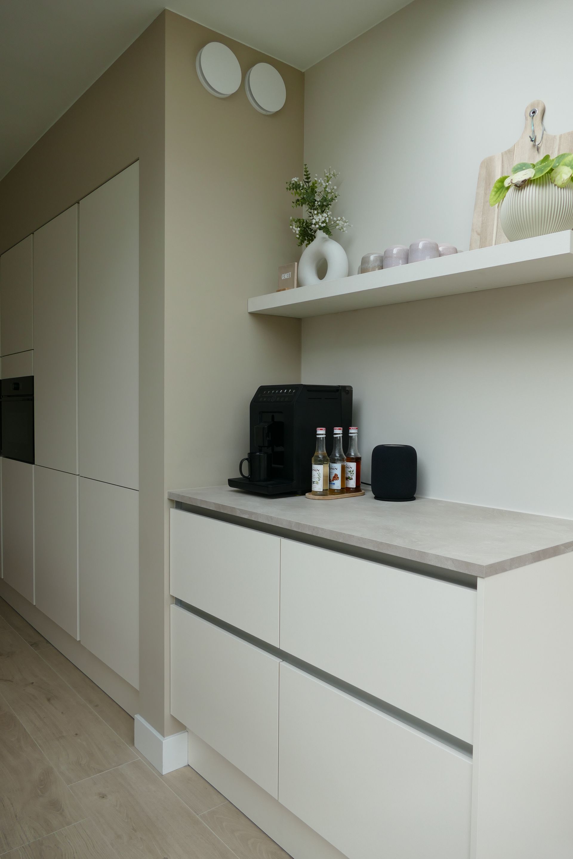 Toen de keuken eenmaal geplaatst werd, sloeg de paniek toe: de kastjes hadden een duidelijk gelige ondertoon en pasten totaal niet bij het kleurenpalet dat wij voor ogen hadden. We probeerden van alles met verschillende beigetinten, maar dat maakte de gele gloed alleen maar zichtbaarder. We zagen door de bomen het bos niet meer...........
